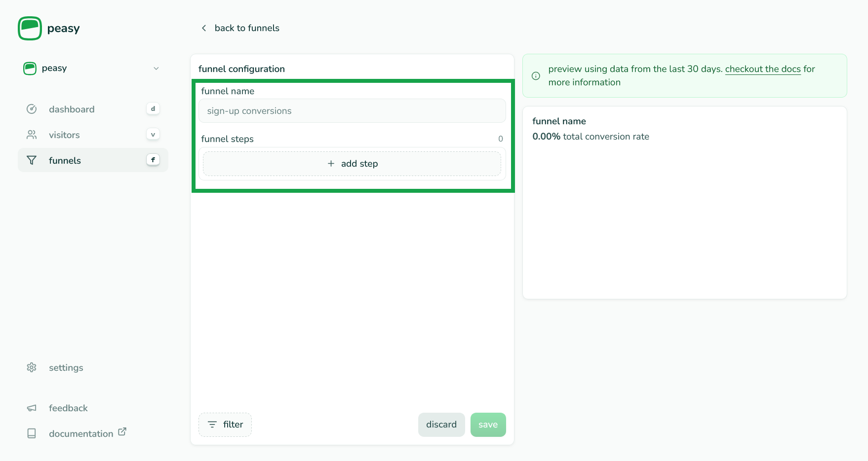 funnels are created by navigating to the funnels page on your dashboard and clicking the create funnel button. a page will appear where you can set your funnel name, its steps and filters.